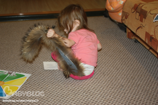От папиного пуховика сняли воротник) и это был кошкин хвостик. поочереди были кошечами, Грациозно ползали перед папой))