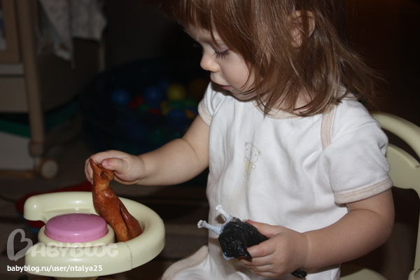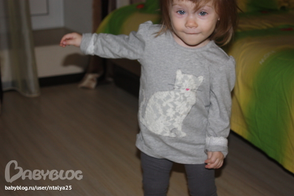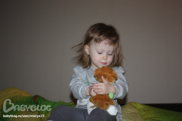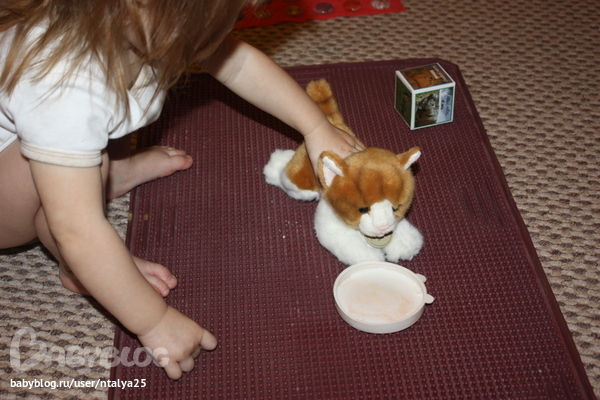 Купили Настюше игрушку - кошечку, купили и забыли и лежала она в дальнем ящике. Вот я и решила, что пора бы нам с Клепкой поиграть(назвали Клепа - так зовут кошечку у Настиной крестной, к которой мы ездили в гости в эти выходные. Насте Клепа очень понравилась, оан за ней бегала и звала ее кс-кс. Настена знает как мяукает кошечка и говорит, но редко - НЯУ, больше ей нравится звать кису кс. Вот она- наша Клепа.