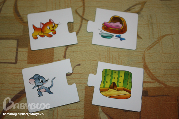 Еще предложила вот такие пазлы. искали кошкин домик и мышкин домик. Настя поняла суть игры. Можно предлагать и побольше карточек.