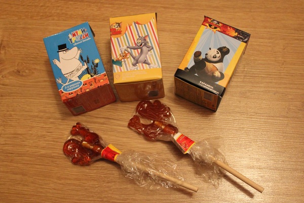 Ну тут всё понятно.Два сахарных петушка на палочке) И три леденца с маленькими игрушками.