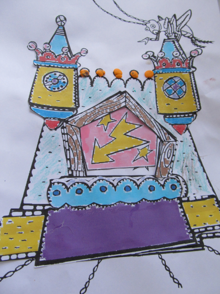 Клеили аппликацию кукольного театра и украшали башенки пластилином: