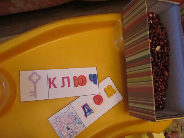 Искали пластмассовые буквы в коробке с фасолью и собирали из них слова: