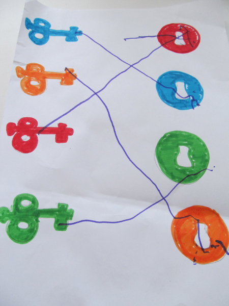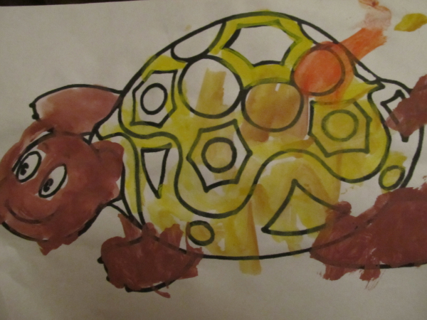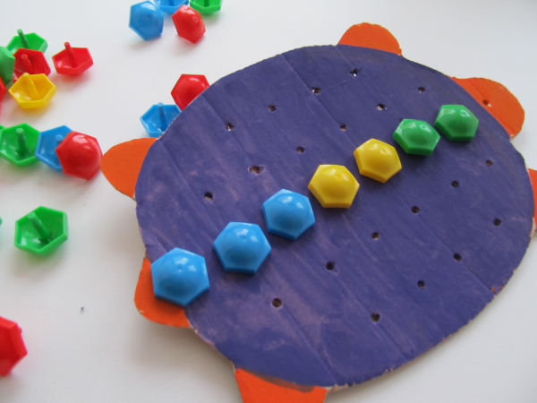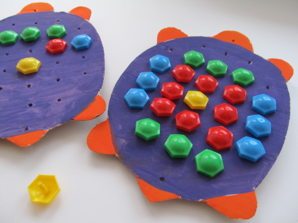 Играли в замечталельную игру "Тортилла". У нас два варианта игры. Самый простой, когда Соня на панцире черепахи сама выкладывает произвольный узор из мозаики: