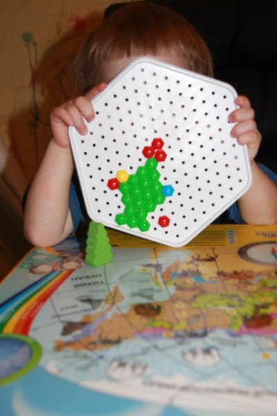 Сегодня у нас было задание -собрать из мозаики ёлочку и украсить ее! Я показывала куда вставлять фишку.Даня делал!