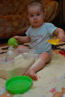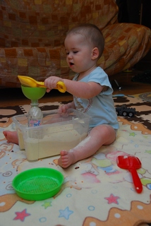 Коробок у нас пока четыре - манка, горох/фасоль, гречка, пшено. Самая удачные это фасоль с горохом и манка (манку мелкая и потом обязательно где-то остается и к пяткам прилепает, а фасоль с горохом покрупнее собрать легче). Коробки у нас икеевские с крышками, оч. удобно. По задумке нужно было сначала просеить от фасоли через сито , а потом пересыпать в бутылку с помощью воронку, но просеила я сама быстренько (т.к. ведерко от сита мы найти не можем, а имееющее меньше и сито уползало), а когда воронка надоела отдала ведерко с фасольки и игрухами.