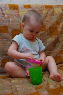 потом коробку выдала, задачей №1 было ее перевернуть, но мама сидела и держала, потом понял что есть занятие поинтереснее, чем просто перевернуть, я вообще-то ему предлагала оттуда выбирать игрушки-неигрушки, но малыш ввел свои правила, вглубь ему ручками лезть не хотелось, выбирал только игрухи, которые видны были, потом находил ложку/совок и т.д. и начинал орудовать с ними, потом как-то научила его все-таки до ведерка доносить. Мне кажется надо пробовать по чуть-чуть, чтобы он привыкал и понимал, что есть занятие поинтереснее, чем запихнуть в рот или рассыпать.