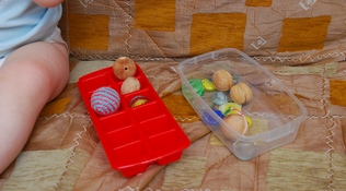 3. раскладывать в ячейки. Идею пока не понимает, пихает как попало, но нравятся шарики (можжевеловые бусины, камушки, грецкие орехи, мячик от пин понга, в зоомагазине много всего найти можно). Хватает не надолго и потом ото всюду достаю эти шарики, поэтому играем не часто.