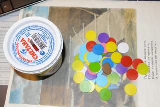 2. Стакашек (ведерко) с крышкой, в крышке отверстие. У нас стаканчик от мороженного баскин робинс, запихиваем туда орешки фундук, камушки (найти можно в "все по 37р." в отделе для цветов), счетные кружочки, и, если положить в орешки желудь, а в цветные камушки обычные и т.д. то малыш будет именно на него акцентировать внимание. Для счетных кружочков (они же плоские) я завела стакашек маленький от сметанки и сделала там узкое отверстие, но пальчиками ухватить кружок за краешек тяжело и затолкать туда получается редко и быстро поэтому надоедает, пока в круглое отверстие пихаем. Складывать еще можно счетные палочки в бутылочку (например от йогрурта) или в уже имеющийся стаканчик. Если есть идеи предложите, что еще можно засовывать?
