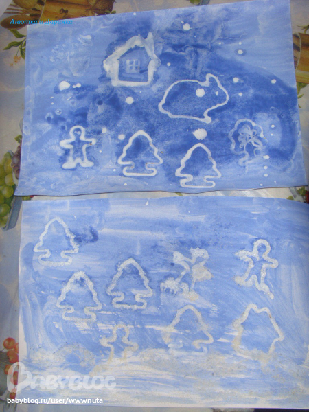 А это сегодняшние творения - открытки. Елочка - штамповка с помошью самодельного трафарета, украшение - ватными палочками. Дед мороз - отпечатка ладошки и аппликация.