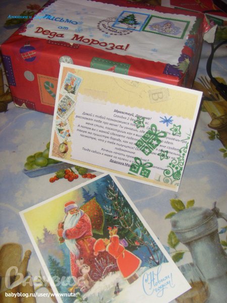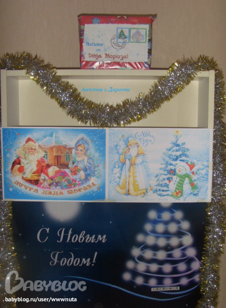 Ящик для писем деда Мороза (только письмами дочка что-то не прониклась, просто рассказываю чем сегодня будем заниматься и что приготовил для нее дед Мороз. Иногда разглядываем открытки):