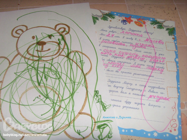 А это наше письмо дедушке Морозу. Ребенок попросил мишку)) Линия через все письмо - это ее подпись)