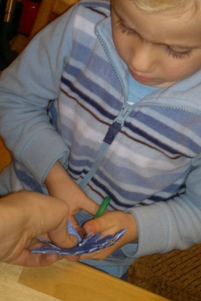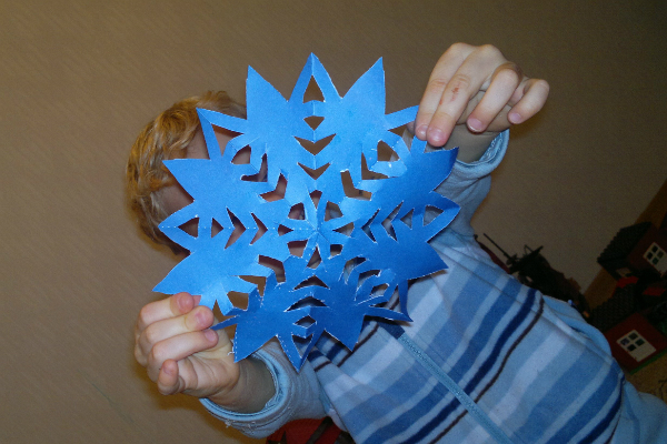 Только на 95 потому что, в 5% входит моя помощь сыну в вырезании снежинки и подсказка в словах (не во всех) букавок) Бумага достаточно плотная, поэтому я держала ее, когда он резал, иначе ножницы сьезжали.