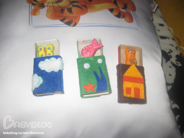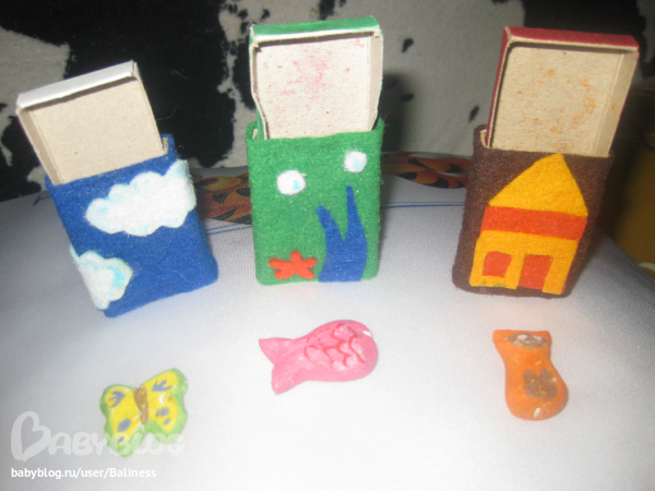 Игры и игрушки для малышей от 1 года до 2х летПодсмотрела идейку у одной замечательной мамочки на ББ (извините, забыла как ее зовут, поделку увидела и сразу побежала делать))). Сделала вот такие коробОчки - небо, море и домик. На небе поселила бабочку из самозатвердивающей глины - первое "трудное" слово Сережки. В первый раз он показал бабочку на шторе и сказал "бабиська", а теперь "ка" куда-то пропало и осталась только "бабись")) В море, само собой, рыбка и в домике котик, который отдаленно напоминает катенка Гава))) (наш любимый мультик сейчас).