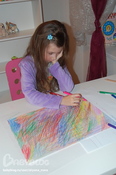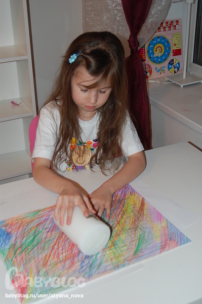 Лист из альбома, восковыми мелками закрасили, свечкой покрыли...