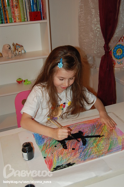 Затем покрываем все черной тушью. На этом этапе дочь оживилась))