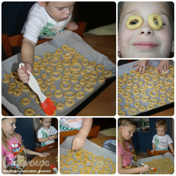 Мнем тесто, катаем колбаски, крутим баранки и опять мнем их или делаем из них бинокли выкладываем на противень.