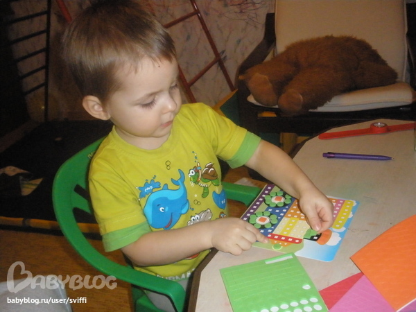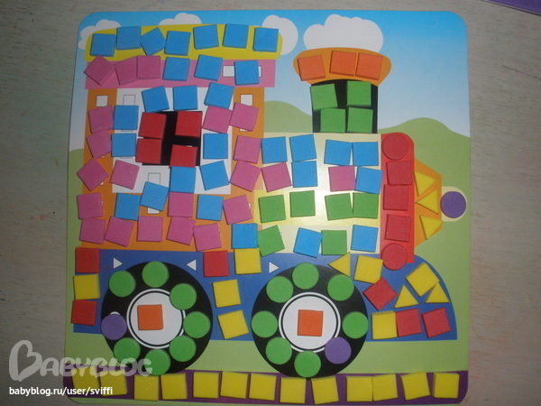 Мистер Умелец или Очумелые ручки (поделки, аппликации, интересные находки, идеи и задумки)Хочу поделиться нашей мозайкой. Случайно была куплена на просторах магазина, и оч. заинтересовала. Даже наверно скорее аппликация. В наборе три штуки, надо приклеивать фигурки на картинку, фигуры геометрические, на кл.основе.(паровоз, скорая помощь и машина). А вот купленные картины с песком не очень понравились, песок оч. мелкий для нас. (хотя манкой рисовать обожает).