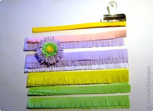 Сегодня училась резать бахрому для цветов. Собрала все идеи в кучу и решила, что для меня так удобнее. Оптимально 5 листов за раз, полоски могут быть разной ширины. Зажимы передвигать по мере надобности. Ножницы любые острые, линейка ограничивает разрез, поэтому режем серединой лезвия ножниц