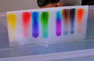 Итак, на куске бумажного полотенца, ближе к его краю нарисуйте маркерами жирные точки, опустите край так, чтобы он лежал на стенке емкости, но не на дне! Медленно влейте столько воды, чтобы она только коснулась края полотенца. И теперь наблюдайте, что произойдет!