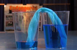 Теперь мы берем 2 стаканчика, в 1-ном из которых должна быть налита вода с красителем. Опускаем один конец бумажного полотенца в стакан с окрашенной водой , а второй конец помещаем в другой пустой стакан. Спустя какое-то время пустой стакан тоже наполнится водой, которая перейдет в него из первого стакана.