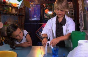 Возьмите сразу 3 стакана - в один налейте воду с синим красителем, в другой воду с желтым красителем, а в 3-й ничего не наливайте! Поставьте пустой стаканчик мужду полными. Теперь возьмите 2 куска бумажного полотенца и опустите в стаканы так, чтобы 1-н их конец был в стакане с водой, а 2-й в пустом стакане. Вы увидите как вода станет переходить в пустой стакан, но и окрашивается там в новый цвет!