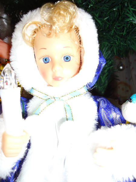 вот снегурка наша,она поет песню и разводит руками,в руках свеча,она горит