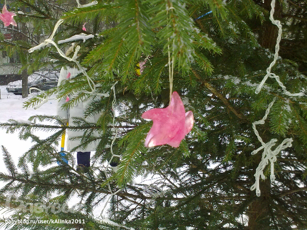 мы тоже сделали свои игрушки - из цветного льда-баначики, апельсинчики и прочие фрукты, а еще звездочки! наконец температура на улице стабилизировалась и мы вынесли наши игрушки для красавицы елочки!
