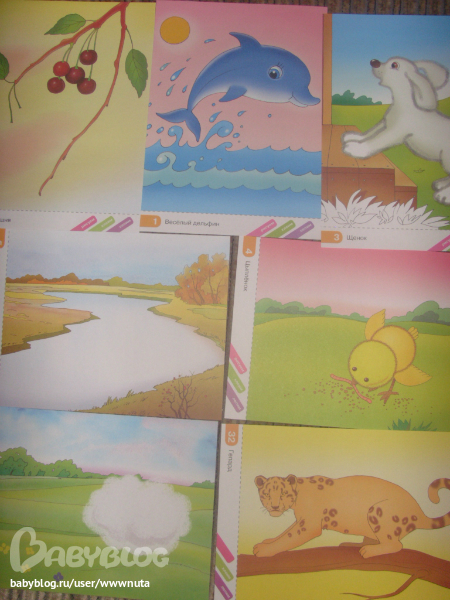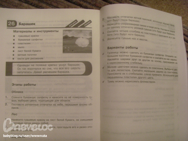 Каждого задания по два листа, так как по задумке авторов - на одном творит мама, на другом малыш. Но мне кажется интереснее сделать два разных варианта из одного шаблона. Каждое задание включает разные техники: на одном листе могут быть камни из пластилина, трава карандашом, облака из салфеток и тд.
