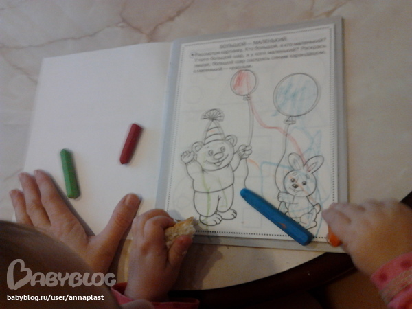 Клеили наклейки. Сложно сказать, Маша угадывает, что куда нужно клеить или понимает, но клеит правильно, хоть и криво:)) Вслух объясняю ей, почему она правильно решила:))