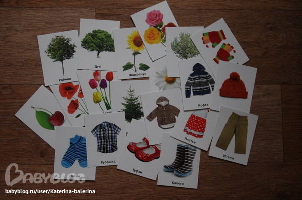 Мне тоже нравится играть с карточками, а не просто смотреть, что действительно скучновато. С помощью них можно и память тренировать, и внимание, и мышление развивать. Например, можно обобщение проводить, т.е. объединять слова-карточки по группам (одежда, мебель и т.д.). Можно тренировать память в игре "Что пропало?", а если иметь еще 1 вариант таких картинок, то и в Memory game (когда выбираются пары). А можно ракладывать в определенной последовательности. Можно сравнивать предметы, это и речь отлично развивает. Я очень люблю серию Мир на Ладошке. Там не только карточки отличные по качеству, но еще и информация и творческие задания. Он, конечно, недешевый, но в принципе 1 тема 395р (это 24 тематических карточки). За качество и содержание можно отдать. У нас они уже 3 года. А племяннице еще нравятся карточки вот такие. Они попроще, но крупнее. Темы там: одежда, мебель, еда, животные, игрушки, окружающее на улице.