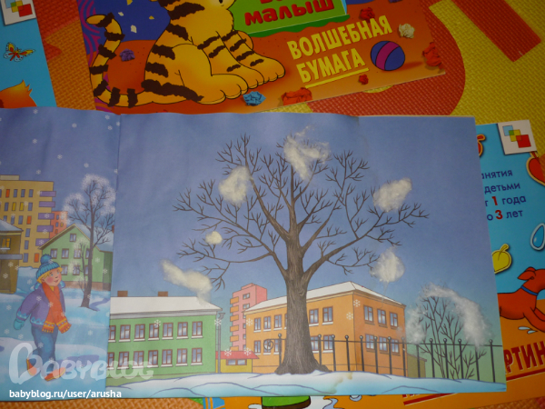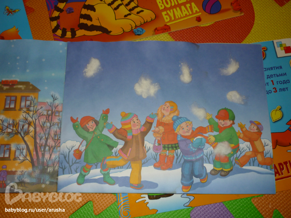 А это пушистые картинки - оч прикольная. Клеим вату. Правда она липнет к рукам при работе с жидким клеем. Но нам все равно нравится.