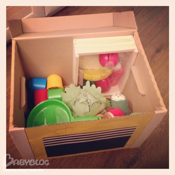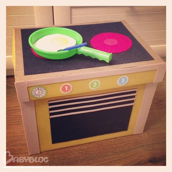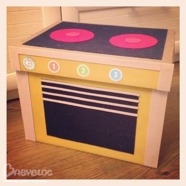 Самодельные игрушкиСделала я для Женьки вот такую простенькую плиту из икеевской коробки. Теперь ребенок с удовольствием "готовит" на ней и всех кормит. Наша чудо плита легко убирается в шкаф и не занимает много места, + в ней мы храним всю посудку и продукты для игры, это очень удобно.;)