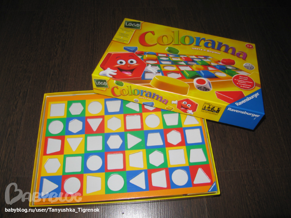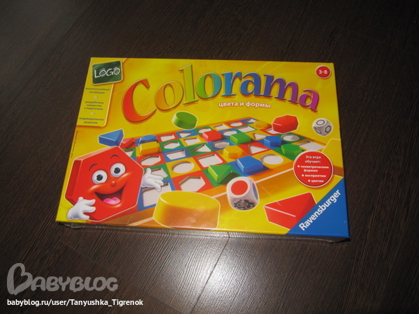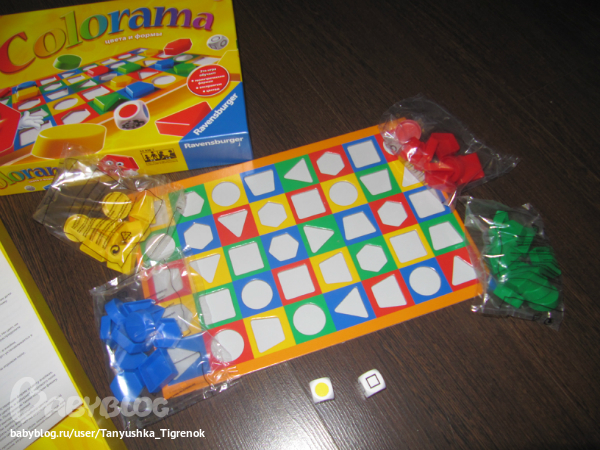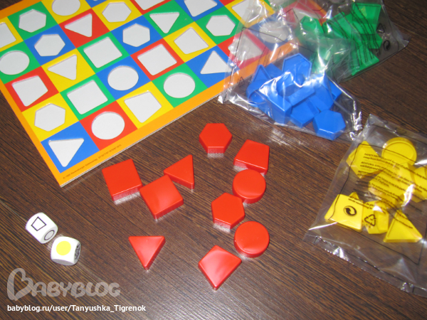 Игра состоит из поля игрового(плотный картон с вырубкой фигур) и фишек-фигурок 4-ех основных цветов(красный,зеленый,синий,желтый)-каждой по 2 и 2 кубика(один определяет фигуру,другой цвет). Игра расчитана для детей 3-8 лет. но мы купили сейчас,нам 2,5 и мы с удовольствием играем.