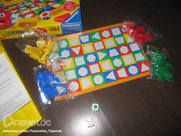 В этой игре по правилам 3 уровня как можно играть в зависимости от возраста...но пока мы играли по своим правилам:кидаем 2 кубика смотрим цвет,фигуру и ставим на поле)))