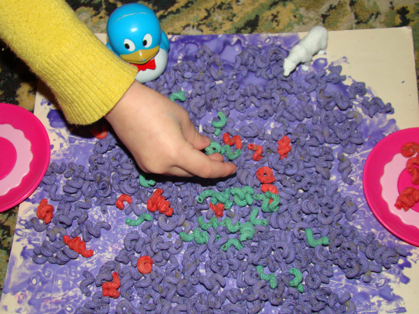 V. Ну и игра для пальчиков – поиграли с покрашенными макаронами. Прежде чем все смешать, наши пингвин и белый медведь