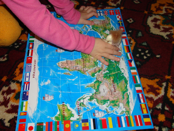 рассматривали карту (Магнитная география) , играли с мячиком – глобусом, собирали карту из пазлов, вставляли животных на материки.