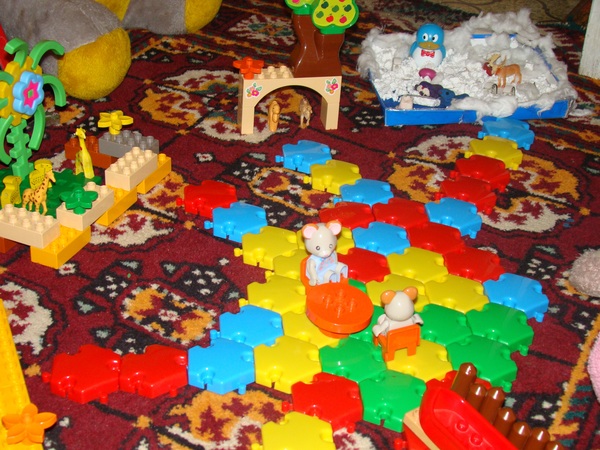 1) Первый день у нас был посвящен Антарктиде и ее главным обитателям – пингвинам. Прочитав книжки о пингвинах, мы и решили их обыграть. Сделали гнездышко из блоков от конструктора, разложила льдинки (листы белой бумаги) и Даша ходила по льдинкам, забиралась на диван ну и прыгала в воду купаться, а затем бежала в гнездышко.