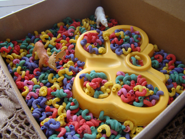 Кормили игрушки , а потом вместе все смешали и заполнили коробку.