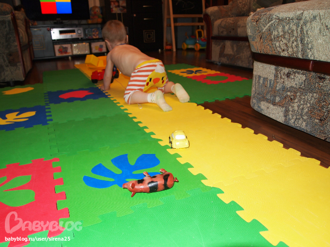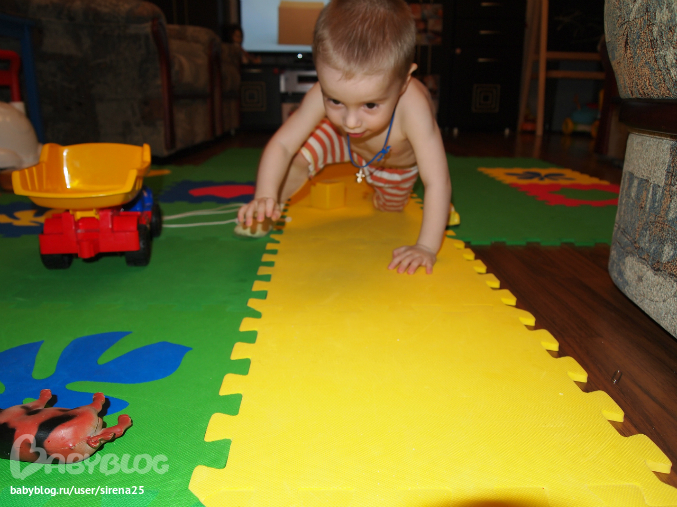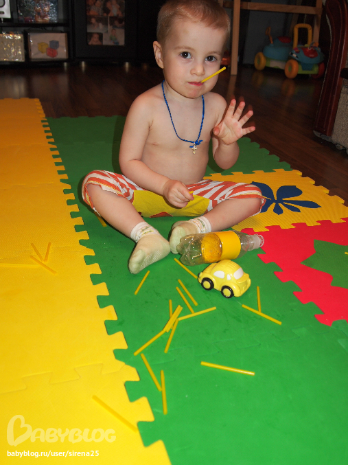 Сделали из пазл-коврика желтую дорожку и ползали, бегали, катали по ней машинки.