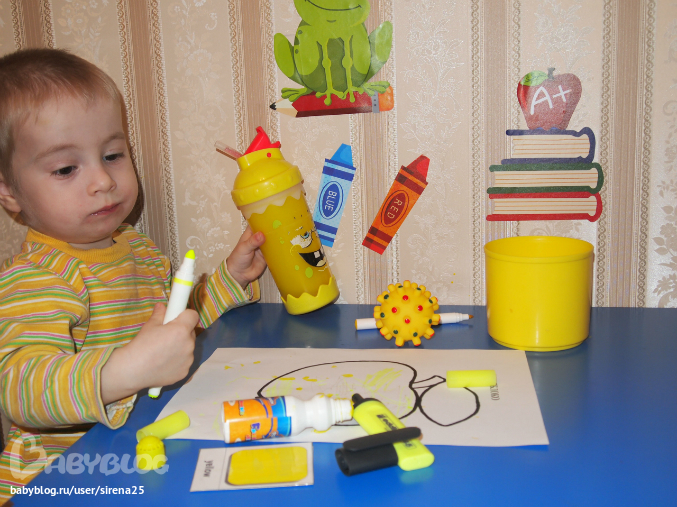 Обращали внимания на желтый цвет вокруг. Другие цвета я в дни конкретного цвета игнорирую, мы "одеваем очки" нужного цвета и видим только его. Думаю, когда они подрастут, такая игра, особенно, с игрушечными очками, будет очень интересна для детей!.