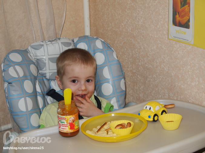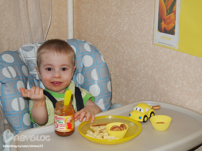 Кушали желтой ложкой+вилкой (набор всех цветов Ikea) и желтая посуда, в др. дни другой цвет.