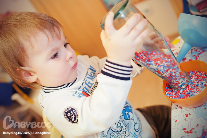 Но Саше решилось продолжить. И он высыпал обратно все в миску, смешал по цветам, и стал опять насыпать в бутылку. И так много раз по кругу, пока не наигрался :)))) А серьезность процесса была чрезвычайная :))) Как же я смеялась :)))