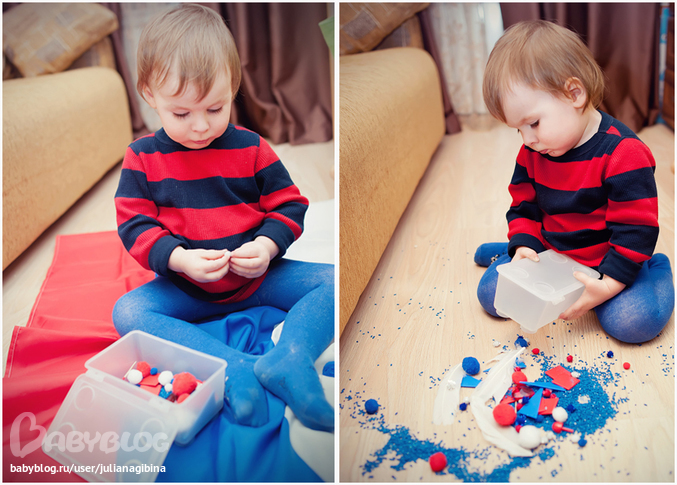 Честно сказать давно я ему их не давала. И вот меня удивили перемены с игрой. Т.к. раньше Сашка вмиг все раскидывал и уже на полу смотрел что же в ней было (делал он это так быстро, что я не успевала даже сфоткать). Сейчас же сынок медленно, по чуть чуть, тщательно и долго вынимал содержимое. Но потом все же не выдержал и быстренько перевернул :))))