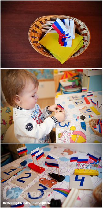 Продолжаем работать над математикой. Поэтому в монтессори понедельник включила вот такую вот игру. По правилам игры нужно было тянуть карточки, на обратной стороне карточек была цифра. Ну и в зависимости от цифры, нужно было прикрепить на пластилиновый кораблик нужное кол-во флажков. :))) Сашка не очень хотел понимать что от него требовалось, очень хотел играться с флажками и тыкать их так как он хочет. Но потом все таки понял, что я от него хочу :)))
