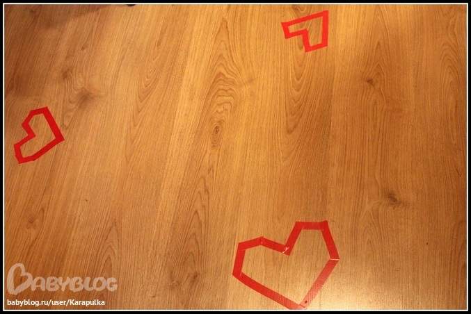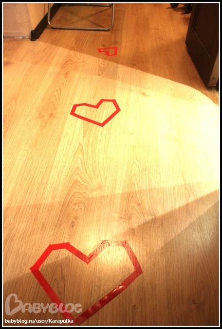 А ещё сердцами мы украсили пол. Они стали хорошей физкультурной разминкой. Андрейка прыгал по ним и по порядку и хаотично и радовался. Зайка мой!