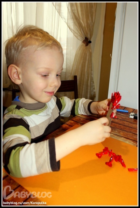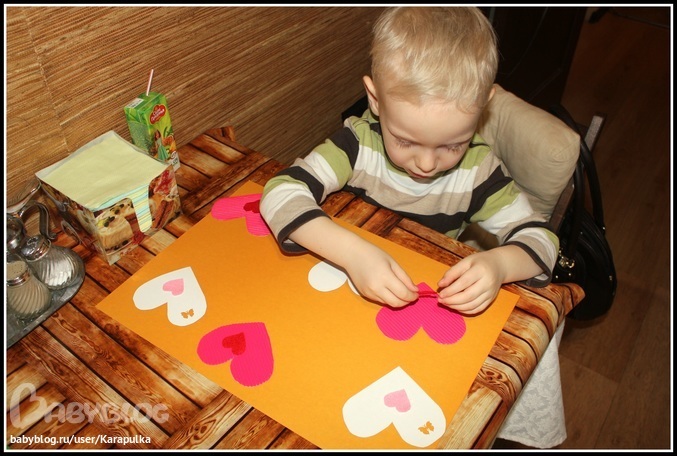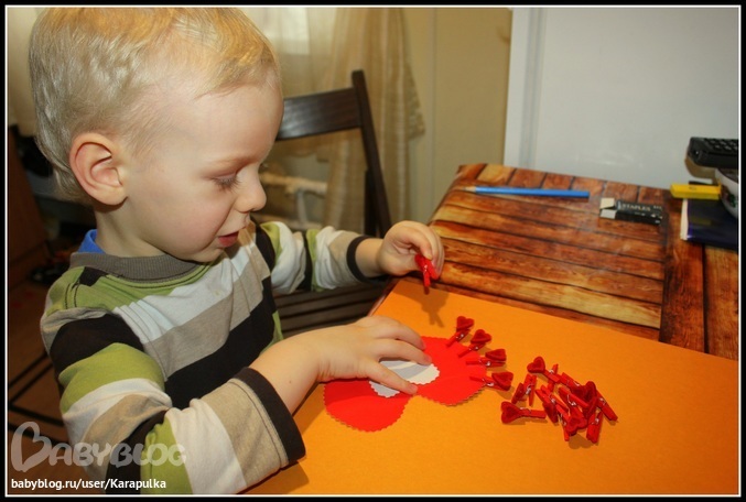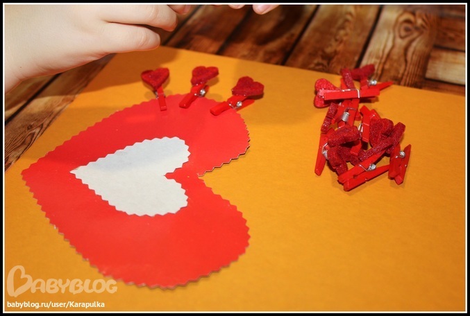 Потом появилось ещё одно большое сердце, которое нужно было по кругу украсить прищепками-валентинками. Сначала Андрюша прицеплял их очень часто и хватило у него только на половину сердца. Но потом быстро понял в чём дело и распределил по всему.