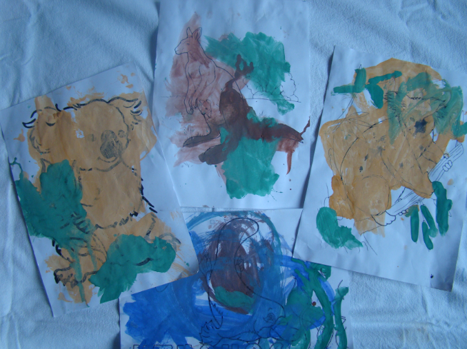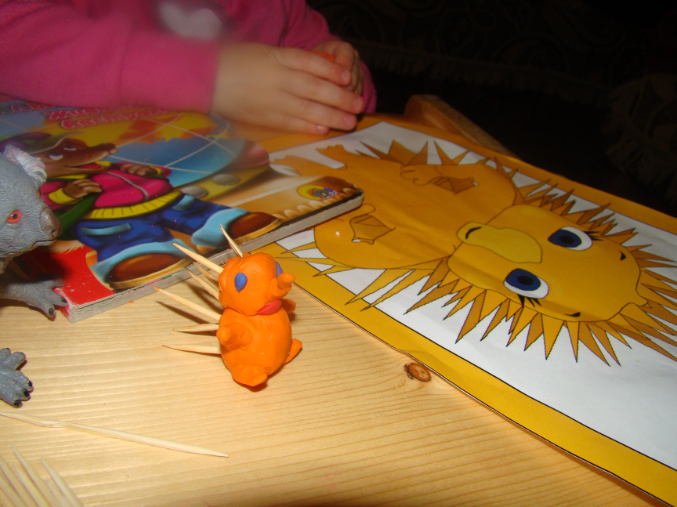 1) играли очень много с нашей тематической коробочкой – сажали попугаев на деревья при помощи скрепок, рыли норки для ехидны, вомбата, утконоса, купали животных в воде, кормили, убегали /прятали животных от собаки Динго.