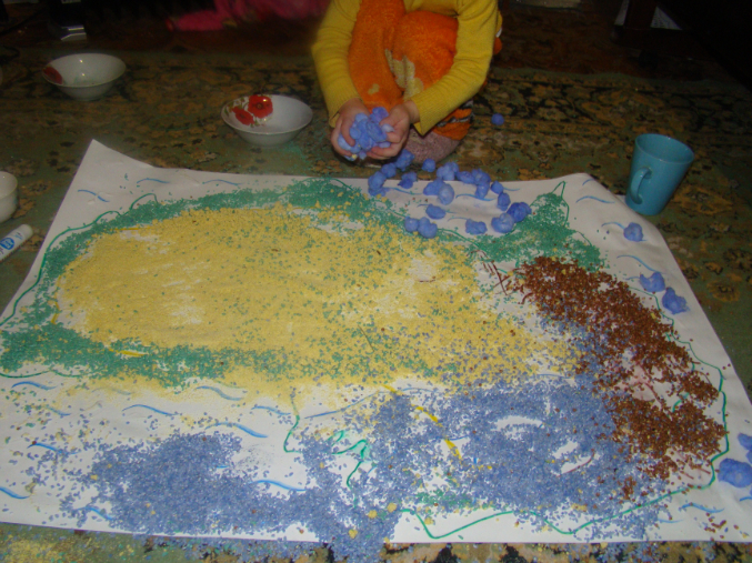 6) А это Австралия, которую Даша украшала крупами: гречка – горы, желтая манка – пустыня, зеленый рис – леса, синий рис и вата синего цвета – река, океан.