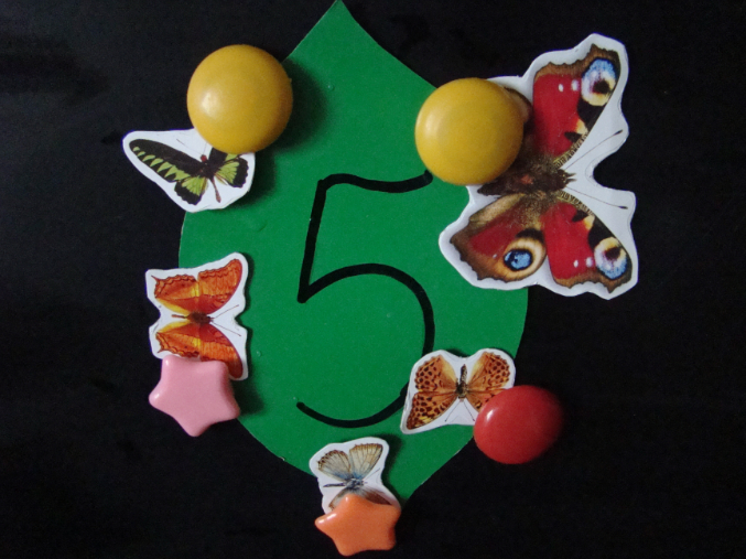 Ну а для того, чтобы совместить два дела, листочки я пронумеровала от 1 до 10 - после чего мы их раскладывали по порядку, сажали соответствующее количество бабочек на каждый листок (при помощи магнитов на магнитную доску). Ну и, конечно, просто кормили листочками медвежонка коалу.