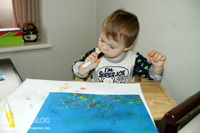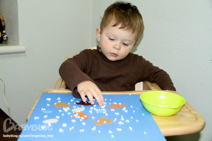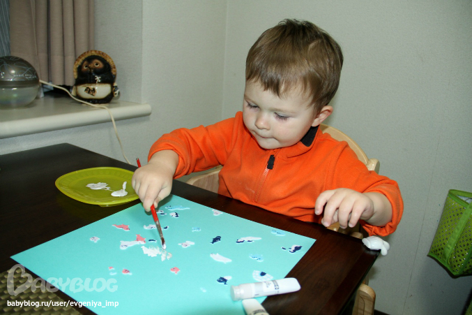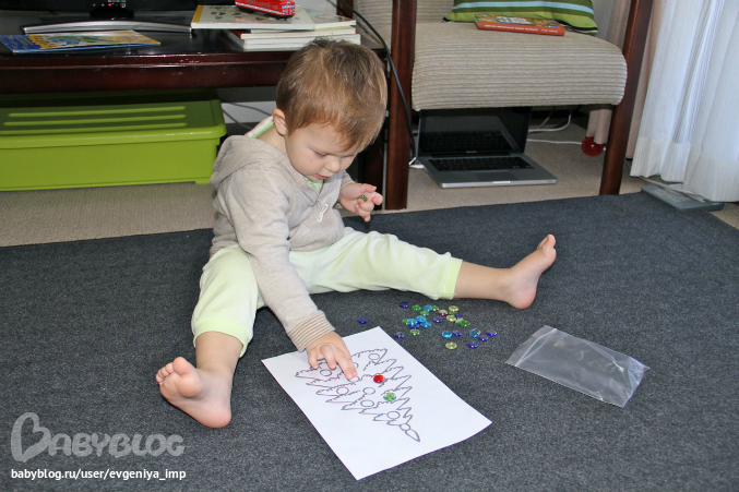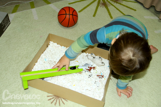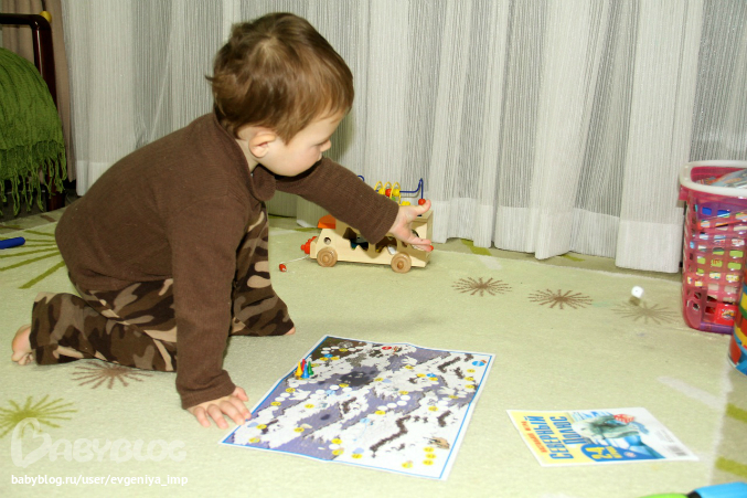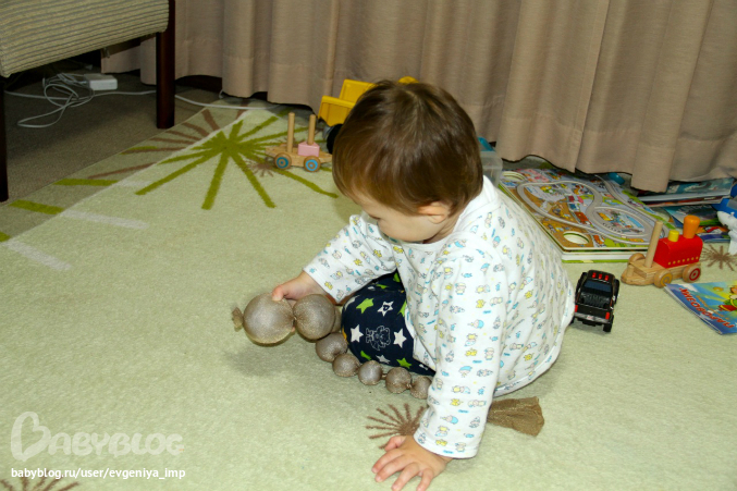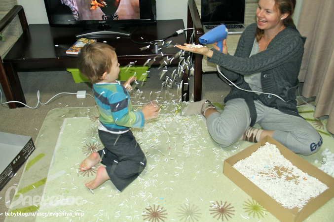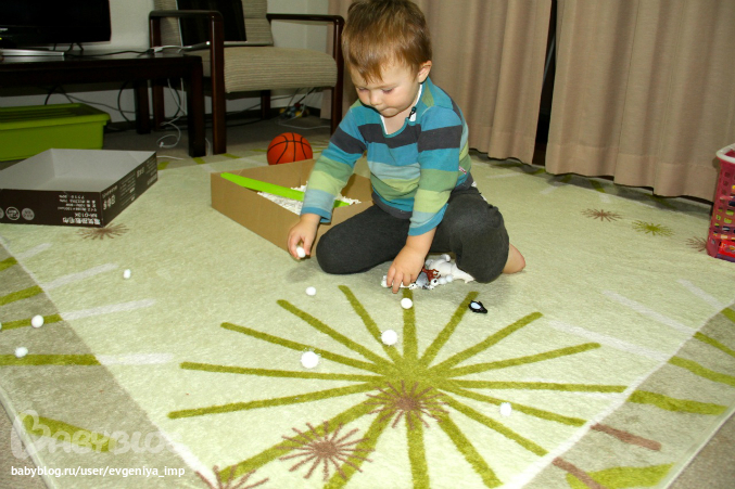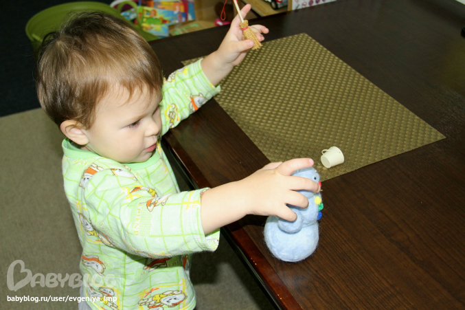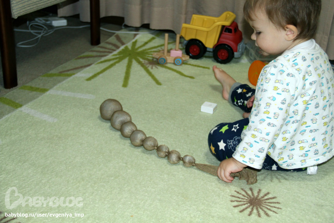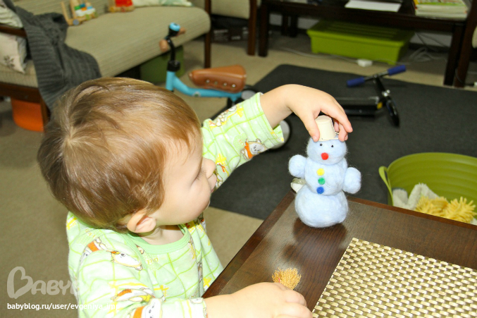 Задумала я сделать снеговика из шариков шерсти. Но еще до погружения этих шариков в стиральную машинку, Даня наигрался с гусеничкой.